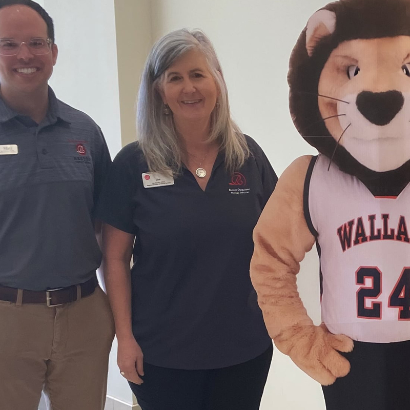 Matt with Lisa Stewart, OTR/L, Regional Director of Clinical Services with Wally, the Wallace State Community College Mascot